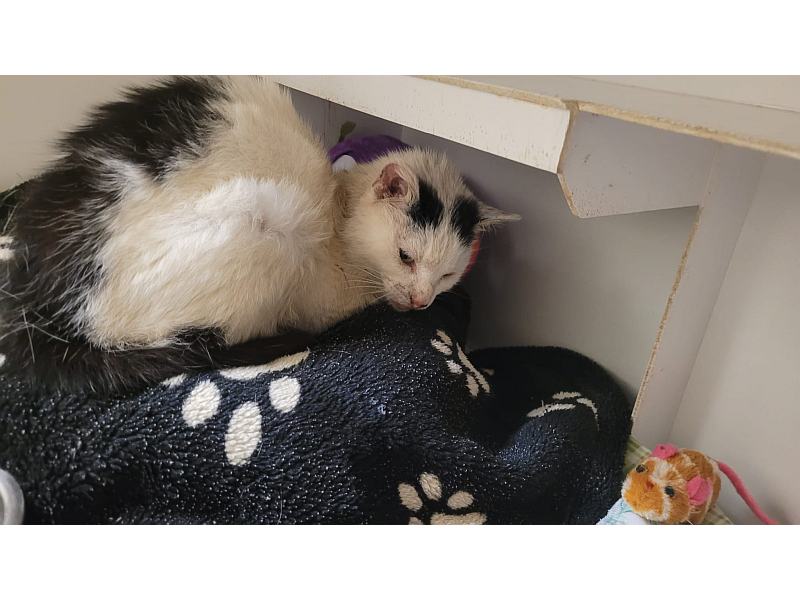 Abgemagert auf 1,8 kg., verfilzt und sehr verwirrt wurde sie zu uns ins Tierheim gebracht.Cathe war ca 18-19 Jahre alt, taub und dement.