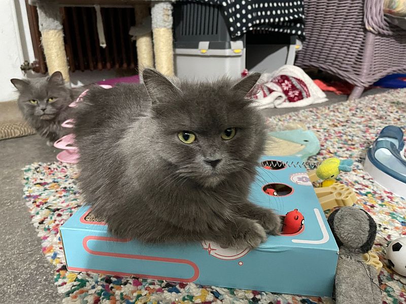 Caruso hat ein Zuhause mit vielen gemütlichen Plätzchen gefunden und der pfiffige Cäsar hat sich seinen Menschen selber rausgesucht, indem er einfach in den Arm gesprungen und dort geblieben ist. Wer soll da noch widerstehen.