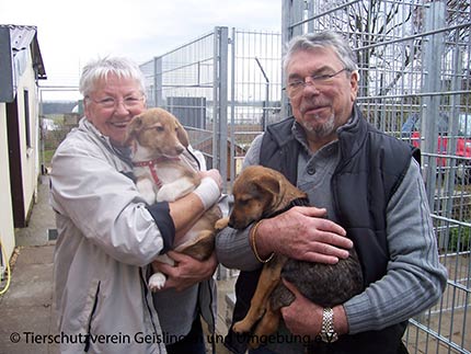 Unsere Mitarbeiter haben die beiden herzlich und liebevoll aufgenommen. Es begann eine Zeit des Kennenlernens, Pflegens und Hegens und vorallem des "Hund Seins". Schnell haben alle die beiden ins Herz geschlossen. Natürlich war auch das Interesse an Ihnen groß und so hatten wir die Qual der Wahl, wohin unsere beiden Waisen sollten. Gabi Hagmann hat nach strengen Auswahlkriterien schließlich entschieden, und so konnten Bonny und Clyde nach einer Kennenlernphase mit ihren neuen Besitzern endlich das Tierheim verlassen! Nun sind die beiden zwar getrennt, aber besuchen sich und fühlen sich "Pudelwohl" in ihren neuen Familien. Die beiden Familien halten übrigens ständigen Kontakt zueinander, was die Fortschritte der beiden Hunde angeht und auch sonst versteht man sich gut. Mehr kann sich ein Hund doch kaum wünschen?