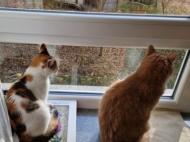 Inzwischen verstehen wir uns ganz gut, spielen Fangen, Verstecken, balgen uns, schauen zusammen aus dem Fenster und beobachten die Vögel oder fressen gemeinsam.