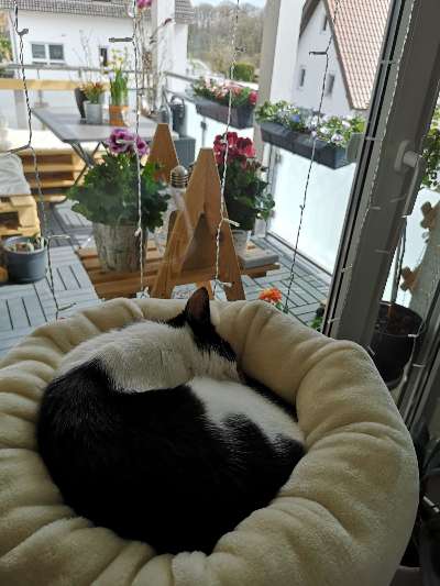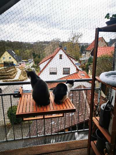 Den Balkon lieben die beiden auch sehr. Wir haben den bisherigen Sichtschutz entfernt und komplett mit einem drahtverstärkten Katzennetz umzäunt.