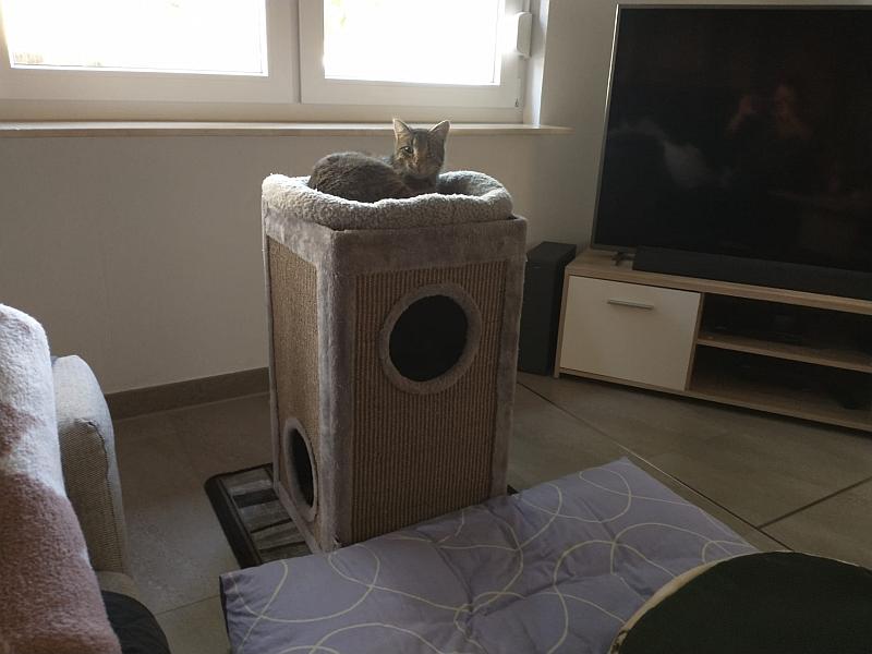 Johnny liebt es in Hütten zu liegen, bei uns ist er begeistert sofort in alle Katzenhütten gelegen.