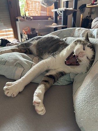 Mittlerweile hat er auch mein Bett als sein Bett eingenommen und kuschelt jede Nacht mit mir.